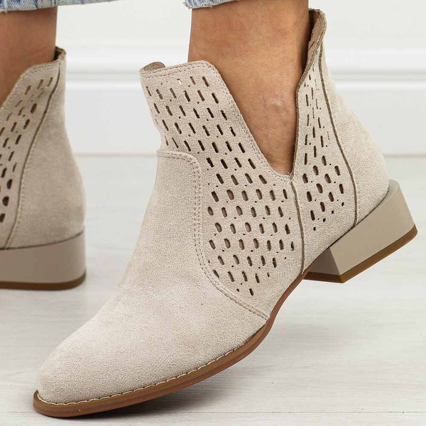 Beżowe ażurowe pólbuty botki damskie na obcasie