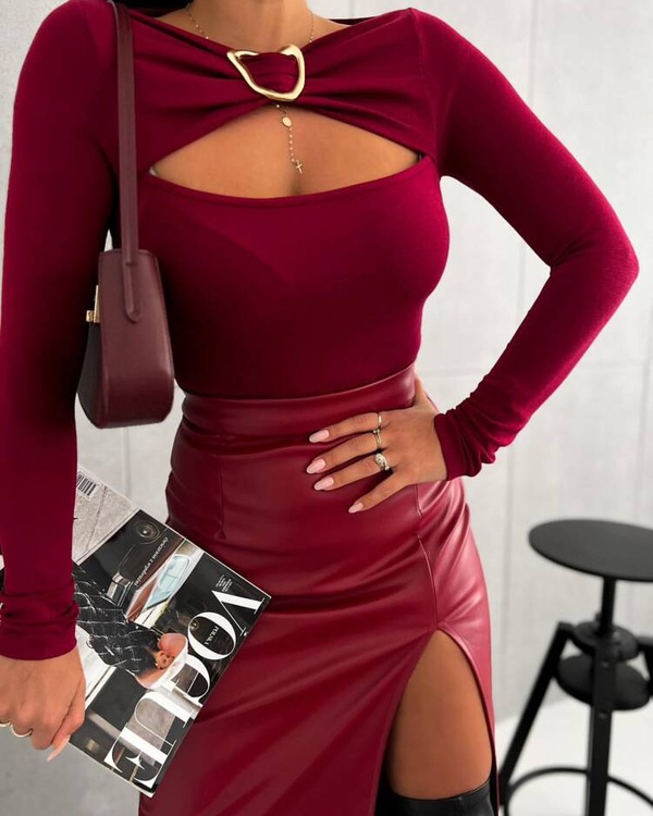 Elegancka bordowa bluzka damska Veronica z przekładanym dekoltem i długim rękawem.