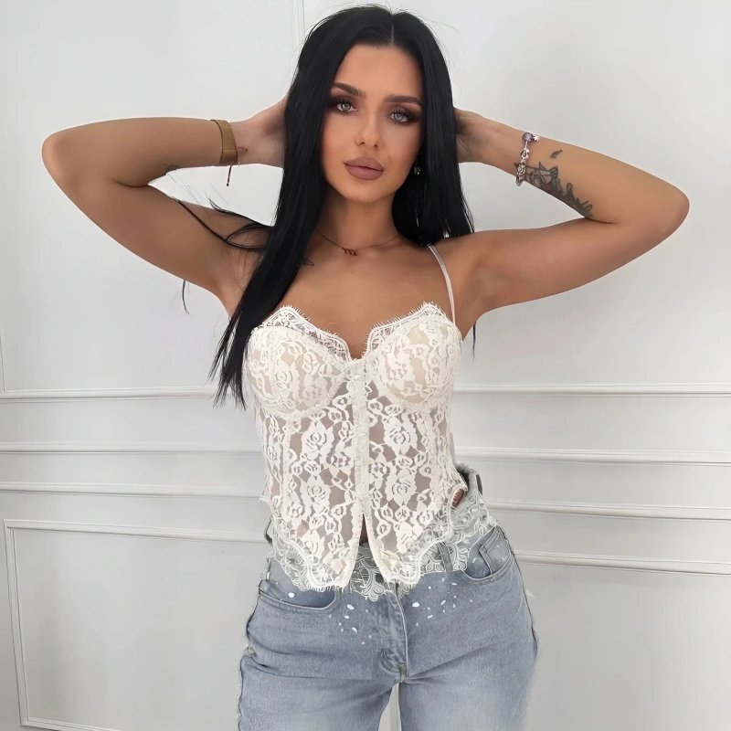 Gorset koronkowy damski kremowy elegancki na ramiączkach top bieliźniany