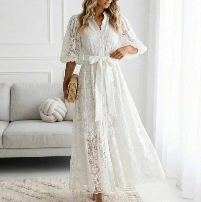 Sukienka koronkowa biała maxi wesele bufki elegancka wiązana DEDUCE