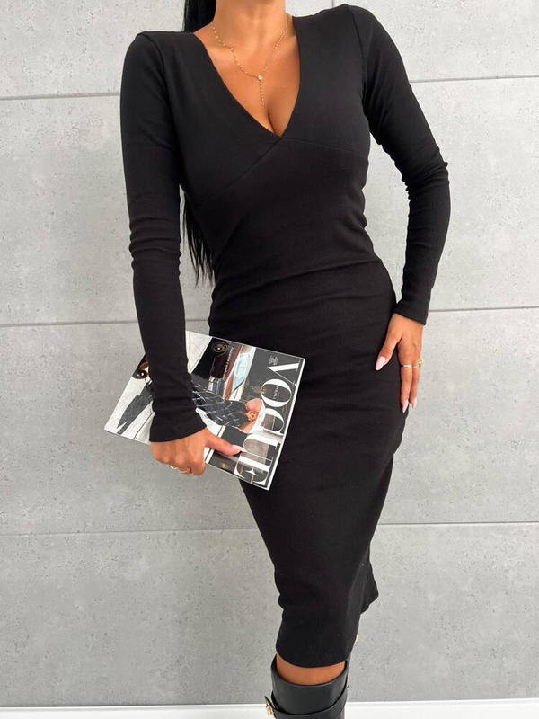 Monochromatyczna sukienka z pionowymi a'la falbanami w okolicach biustu i rozcinanymi mankietami