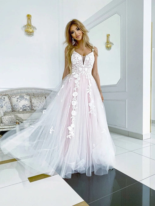 Długa taliowana sukienka Laura pudrowa z rozcięciem odsłaniającym nogę.