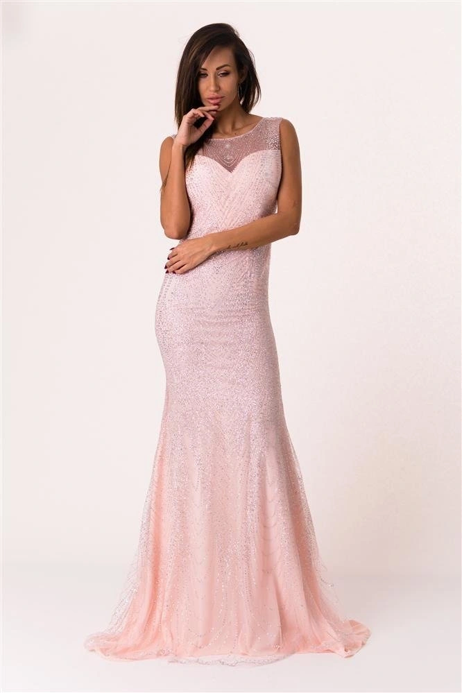 - Długa sukienka, typ syrena, w całości pokryta cekinami.