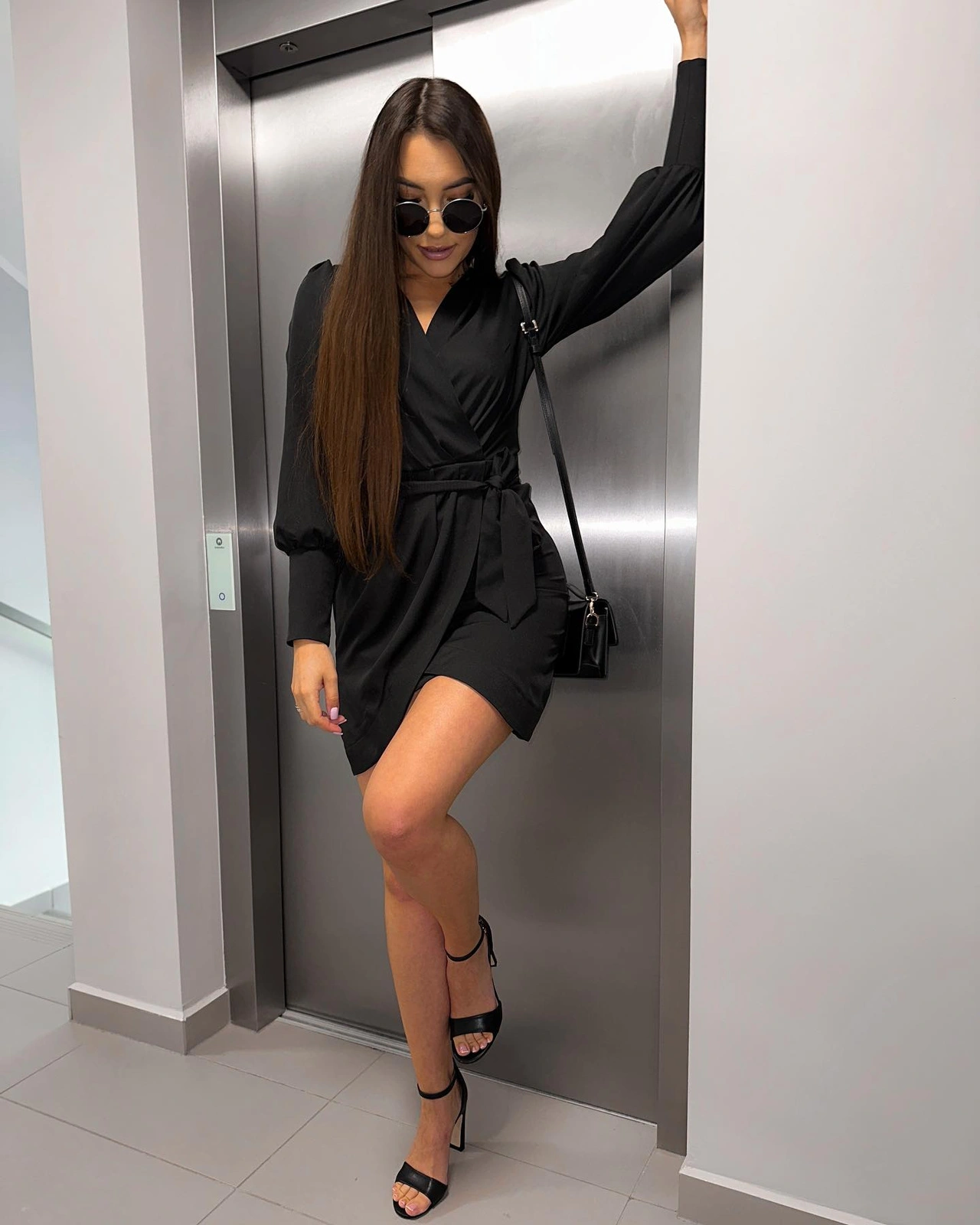 Sukienka ma zakładany, kopertowy dekolt podkreślający biust, długie, zwężane na końcach