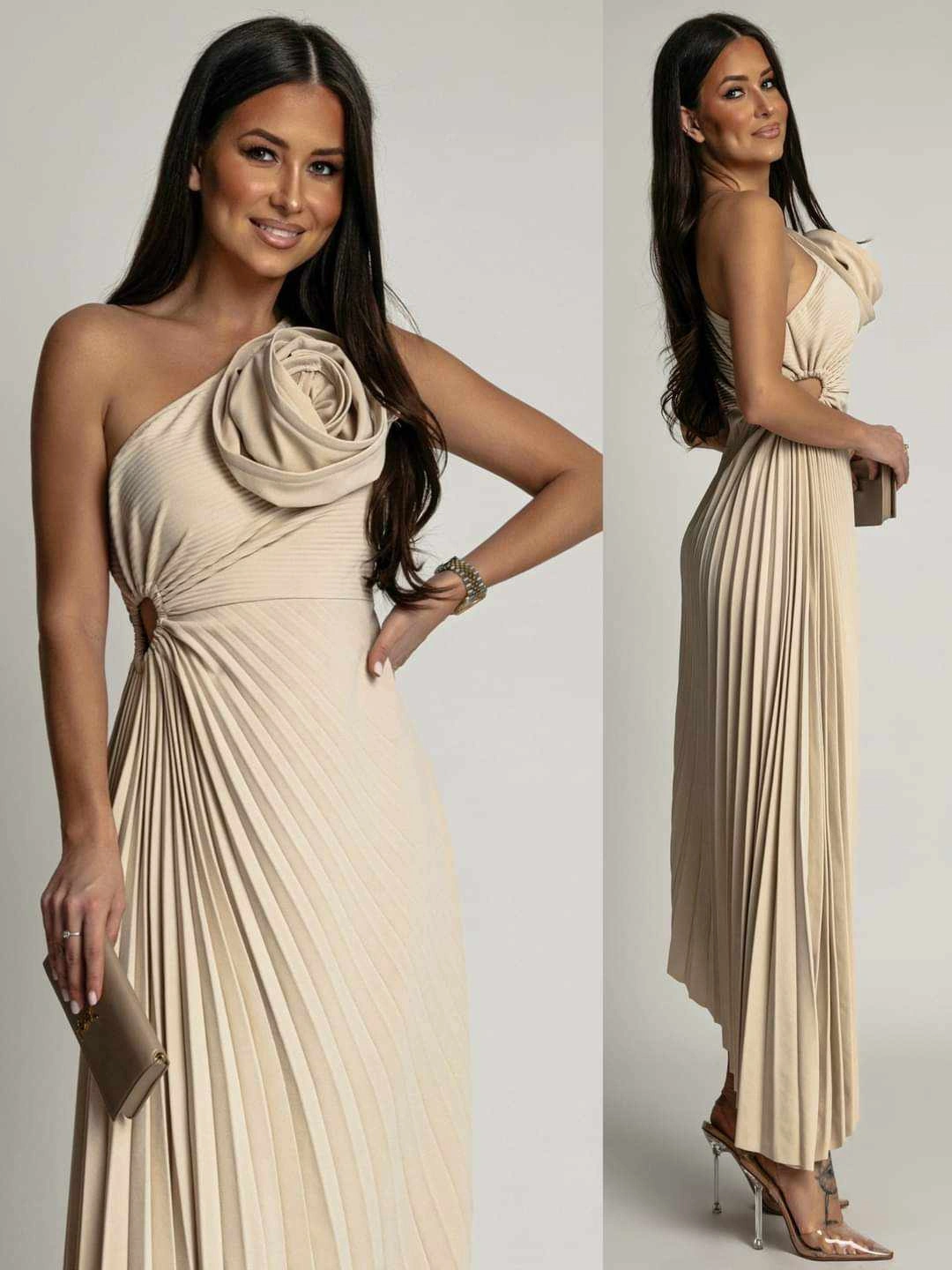 Plisowanie materiału, zdobienie w postaci kwiata oraz fason na jedno ramię. Marszczenie przy talii. Długość midi.