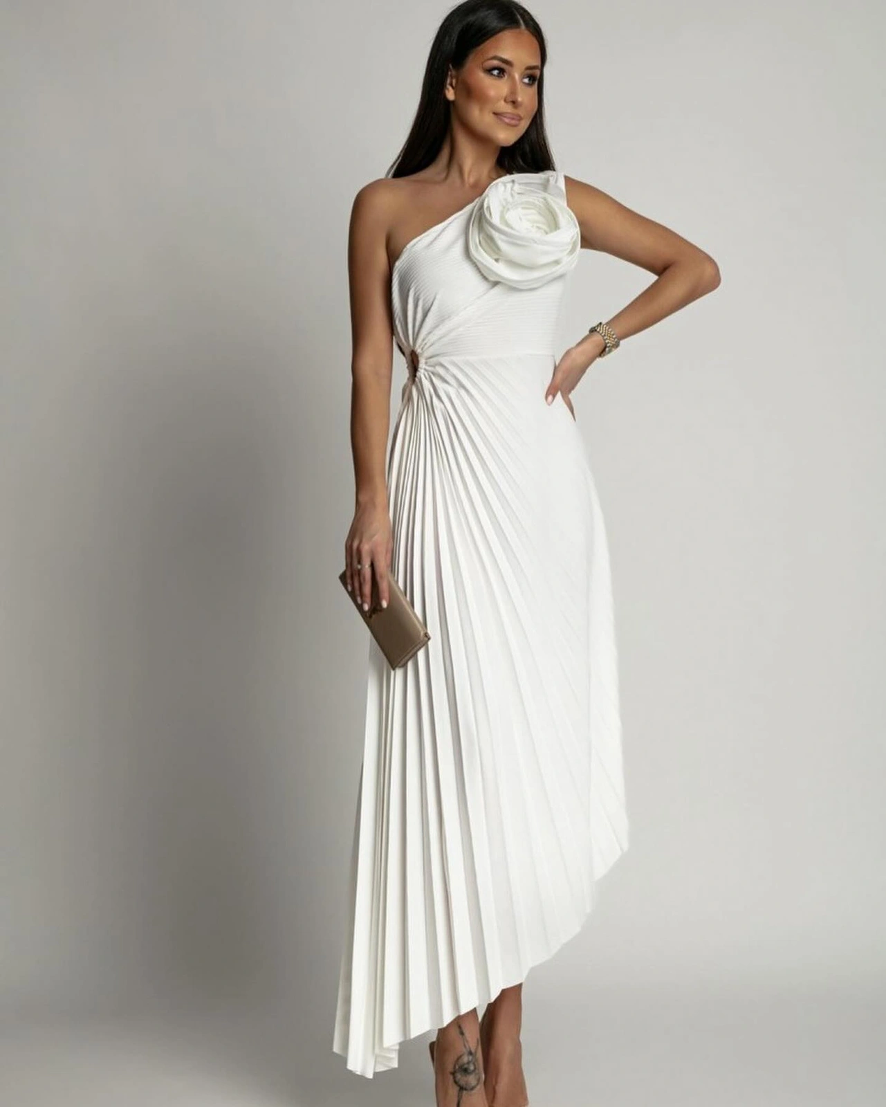 Plisowanie materiału, zdobienie w postaci kwiata oraz fason na jedno ramię. Marszczenie przy talii. Długość midi.