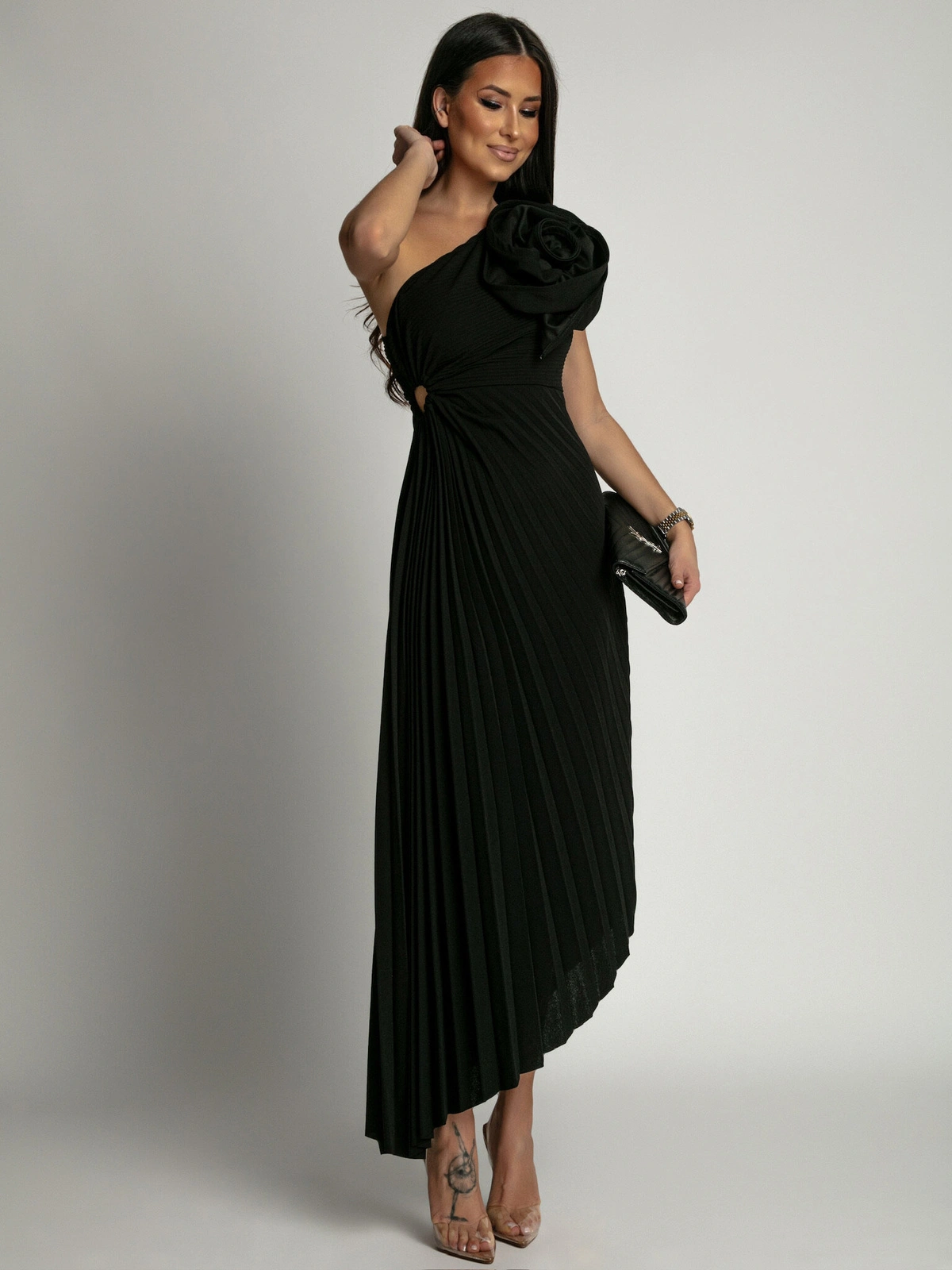 Plisowanie materiału, zdobienie w postaci kwiata oraz fason na jedno ramię. Marszczenie przy talii. Długość midi.