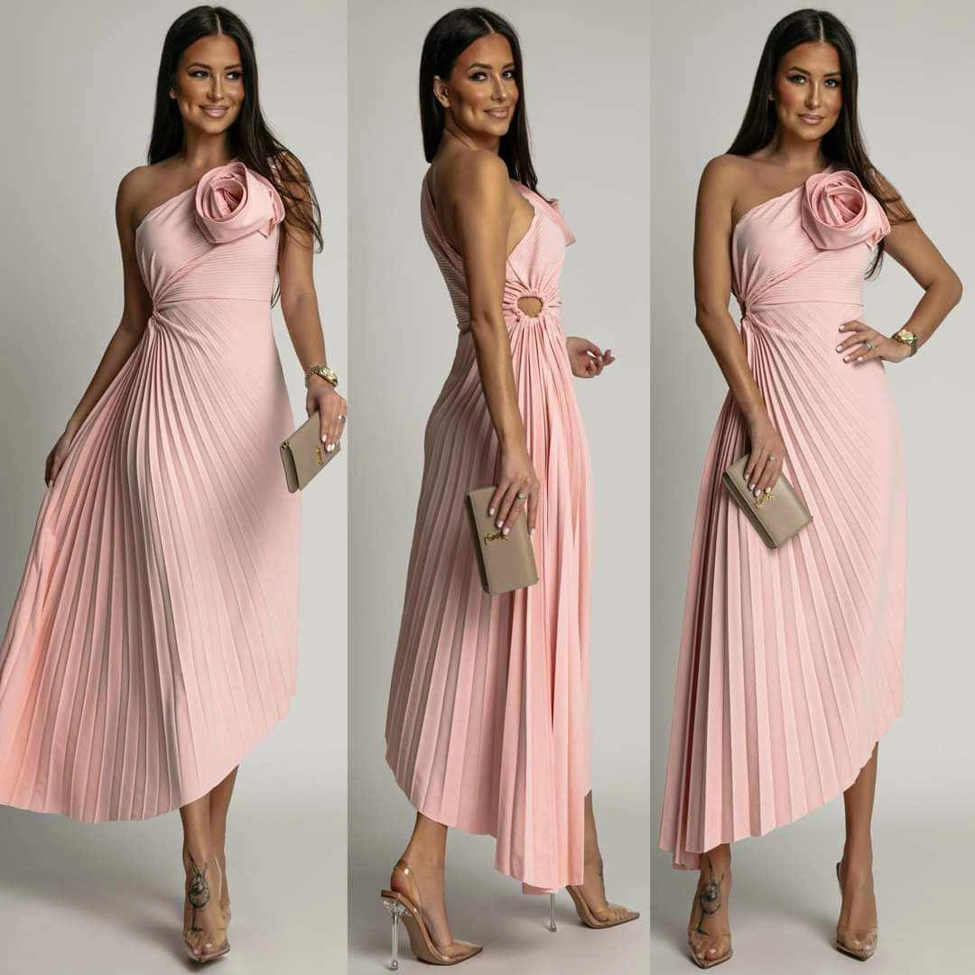 Plisowanie materiału, zdobienie w postaci kwiata oraz fason na jedno ramię. Marszczenie przy talii. Długość midi.