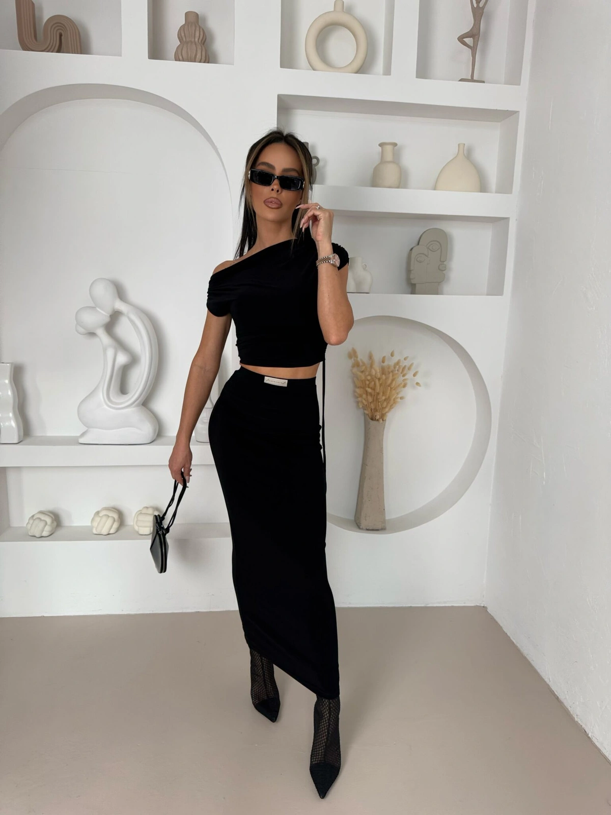 Elegancki i kobiecy zestaw, który wyróżnia się subtelnym marszczeniem, które można regulować i unikalnym krojem. Spódnica maxi z delikatnym marszczeniem na biodrze dodaje lekkości i płynności ruchów, tworząc efektowną sylwetkę. Top z krótkim rękawem, asymetryczny na jedno ramię, z drugą stroną opadającą niżej, stanowi oryginalny element, który przyciąga wzrok. Ten set to doskonały wybór na wieczorne wyjście, randkę czy specjalną okazję, łącząc elegancję z modnym akcentem. Idealnie komponuje się z eleganckimi sandałkami lub szpilkami, podkreślając Twój styl i pewność siebie!