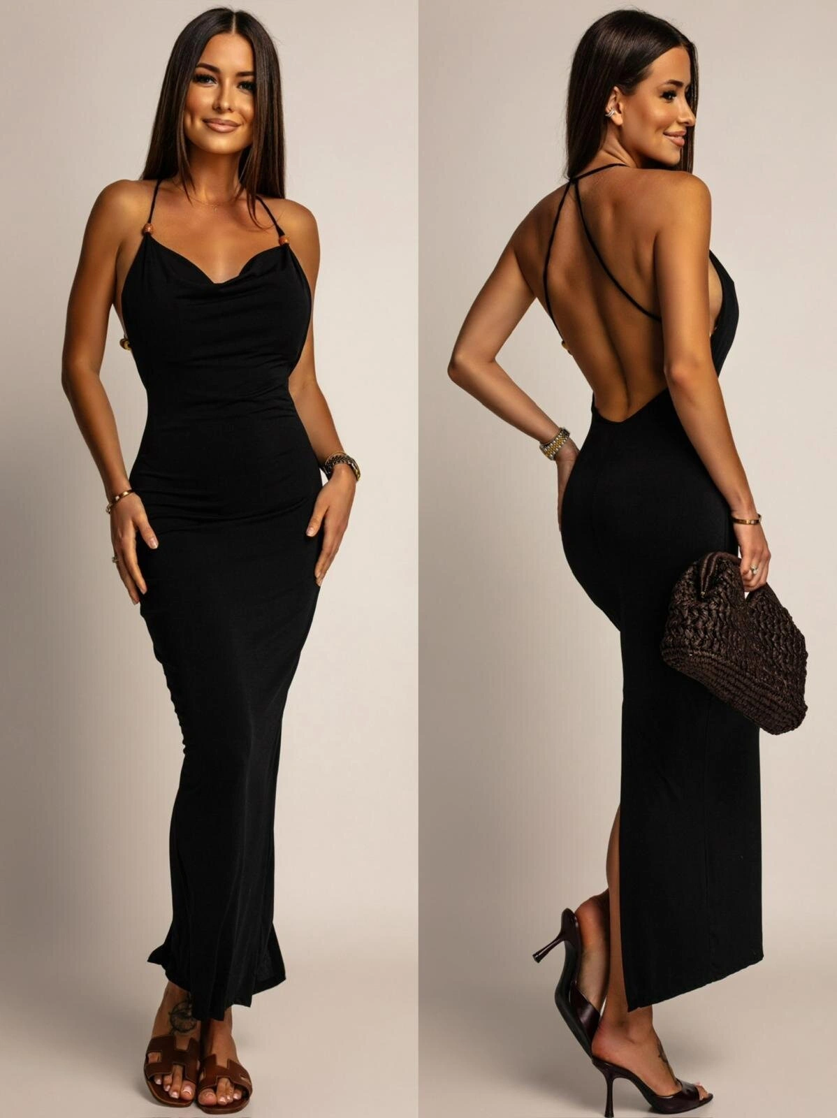 Dopasowana sukienka maxi.Wykonana z elastycznej tkaniny, która pięknie dopasuje się do sylwetki i pokreśli jej atuty. Rozporek z tyłu sukienki.