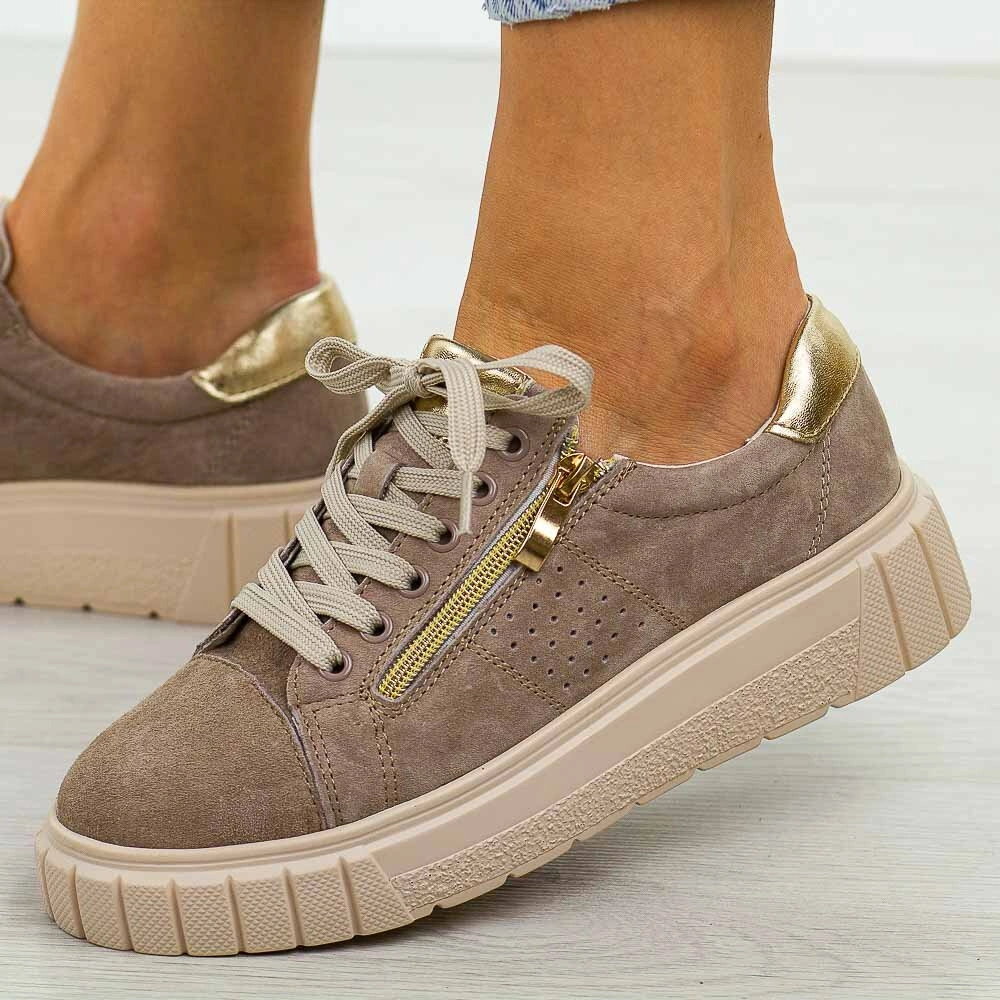 Beżowe skórzane półbuty damskie to idealne obuwie na wiosnę, lato i jesień. Wykonane z wysokiej jakości skóry naturalnej nubukowej, zapewniają trwałość oraz elegancki wygląd. Model wyposażony jest w praktyczne sznurowanie oraz zapięcie na suwak, co ułatwia dopasowanie buta do stopy i zapewnia komfort noszenia. Miękka wkładka ze skóry naturalnej zwiększa wygodę użytkowania nawet przez długi czas. Półbuty osadzone są na masywnym spodzie, który dodaje im nowoczesnego charakteru i zapewnia stabilność. Dzięki uniwersalnej kolorystyce i stylowemu designowi doskonale komponują się zarówno ze stylizacjami casualowymi, jak i bardziej eleganckimi. Świetnie pasują do jeansów, spodni materiałowych, legginsów, a także sukienek i spódnic, stanowiąc modny i wygodny wybór na co dzień, do pracy czy na spacer.