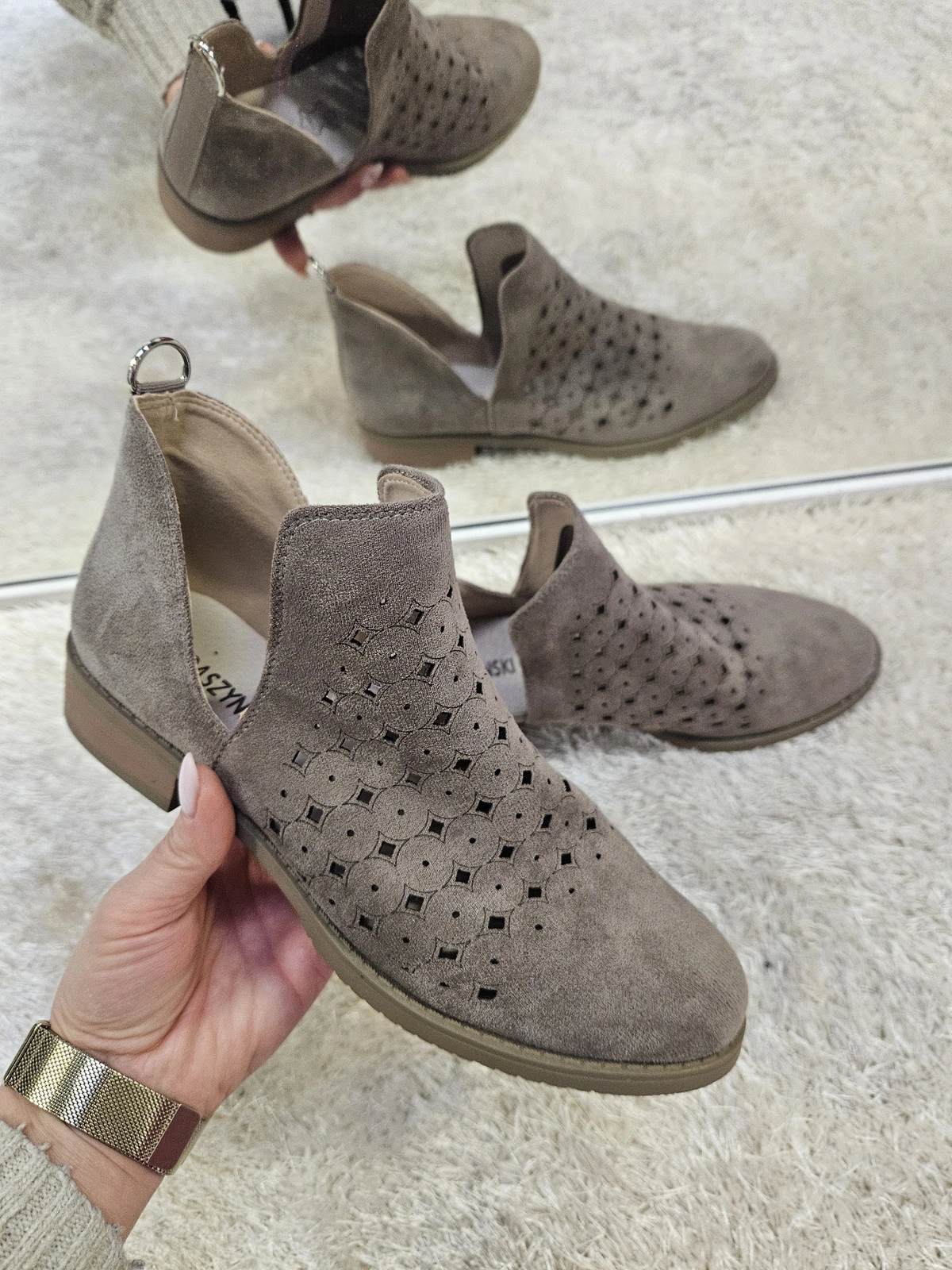 Te brązowe ażurowe botki damskie na płaskim spodzie są idealne na wiosnę, jesień i mniej upalne dni letnie. Ich cholewka w kolorze brązowym wykonana jest z materiału zamszopodobnego, co nadaje im delikatny wygląd, a ażurowany wzór zapewnia dodatkową przewiewność. Wkładka wewnętrzna wykonana ze skóry naturalnej podnosi komfort użytkowania, zapewniając miękkość i oddychalność. Okrągły nosek oraz wsuwane zapięcie sprawiają, że są łatwe w zakładaniu i wygodne w noszeniu. Solidny, elastyczny spód zapewnia stabilność i pewność kroków. Te buty są pełnowartościowe, starannie wykonane i cechują się wysoką trwałością. Doskonale komponują się zarówno ze spodniami, jak i sukienkami, uzupełniając różnorodne stylizacje. wysokość buta: 12.5 cm, obcas: 3 cm , spód: 0.9 cm