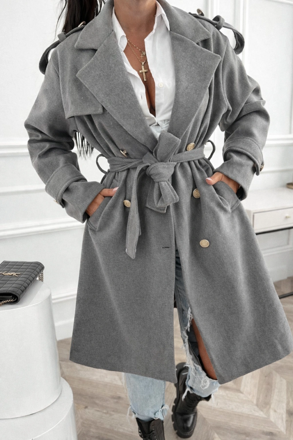 Klasyczne Wiązany Płaszcz Damski Coco - szary