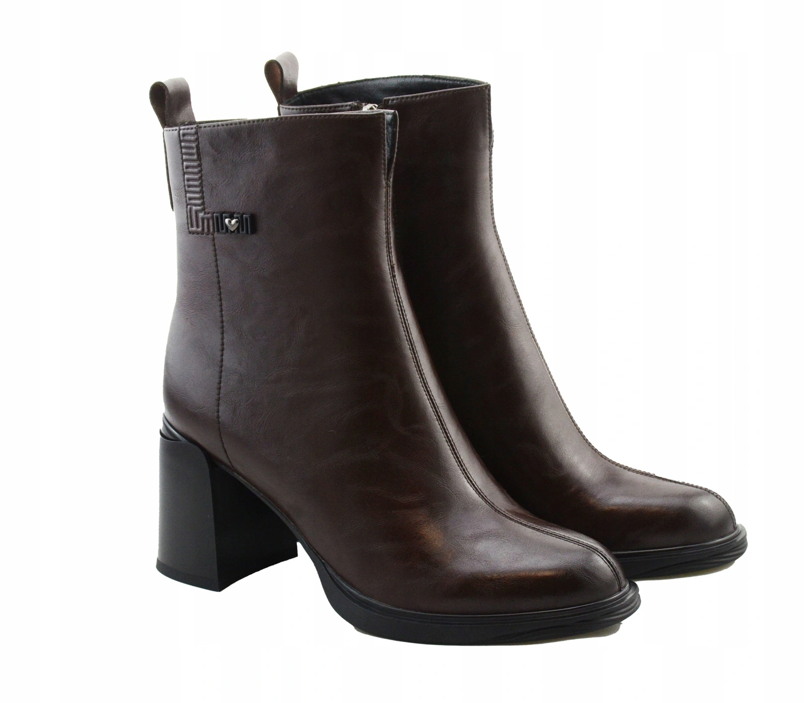 Botki damskie skórzane na obcasie ocieplane brązowe