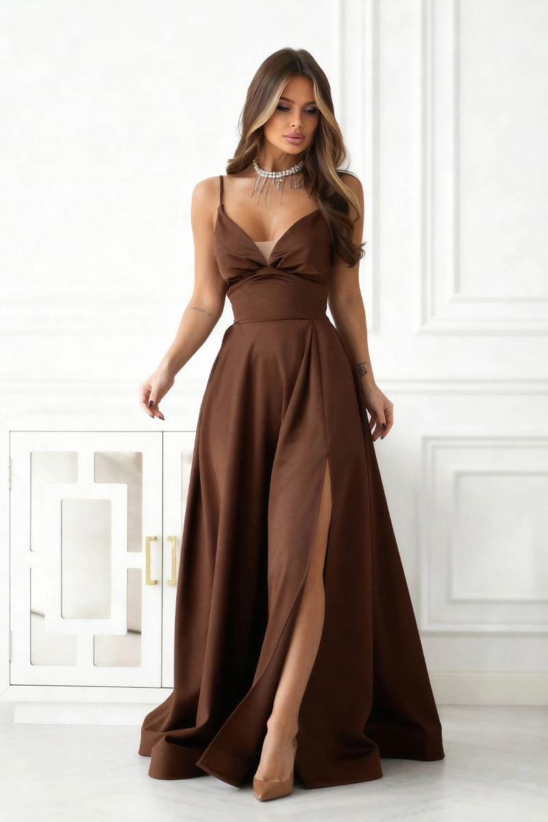 Długa Suknia Wieczorowa z Gorsetowym Sznurowaniem Elizabeth czekoladowy