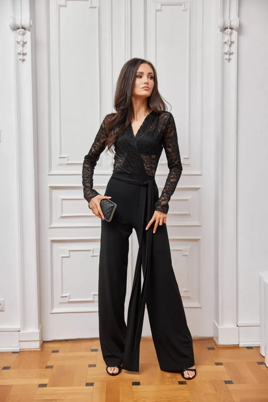 Elegancki KOMBINEZON Z KORONKOWĄ GÓRĄ I WIĄZANY W TALII CZARNY