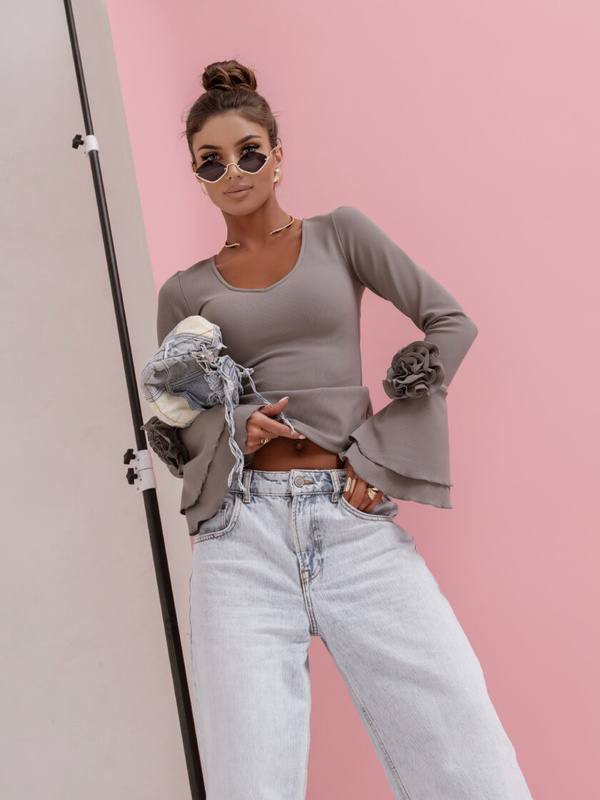 Elegancka Bluzka ROSEA z różami i długim rękawem Szara