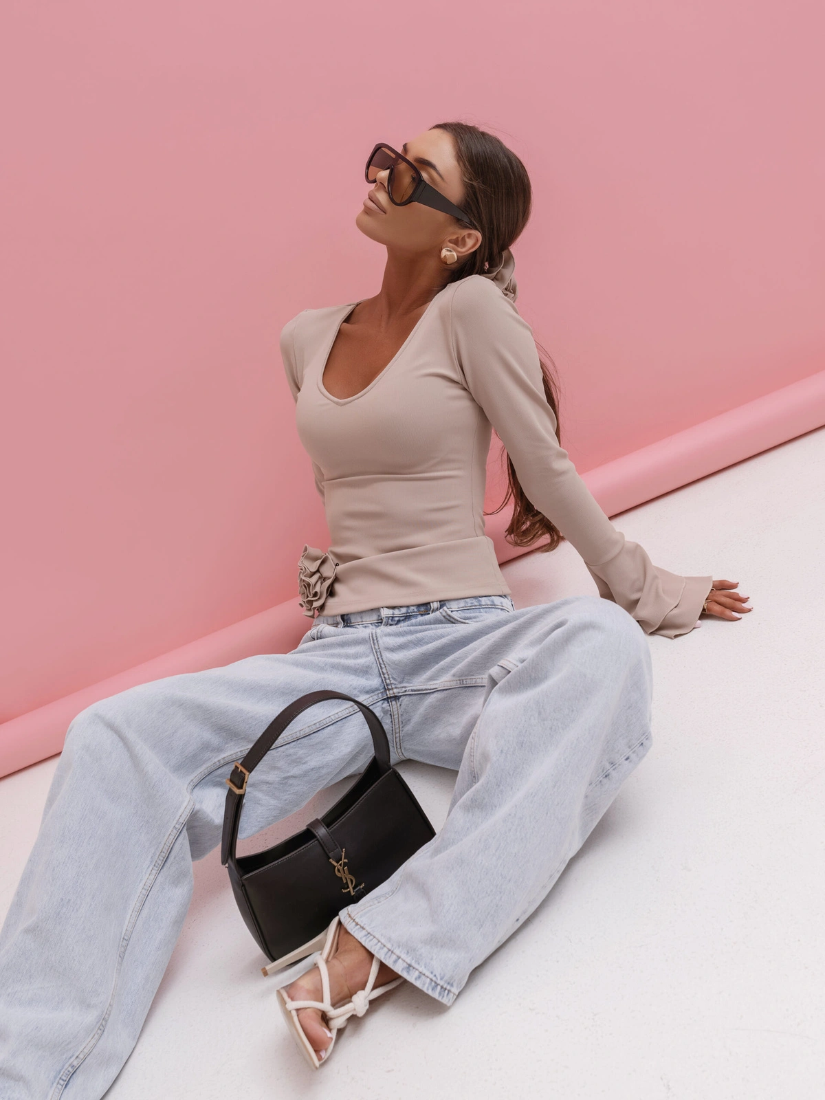 Elegancka Bluzka ROSEA z różami i długim rękawem Beżowa