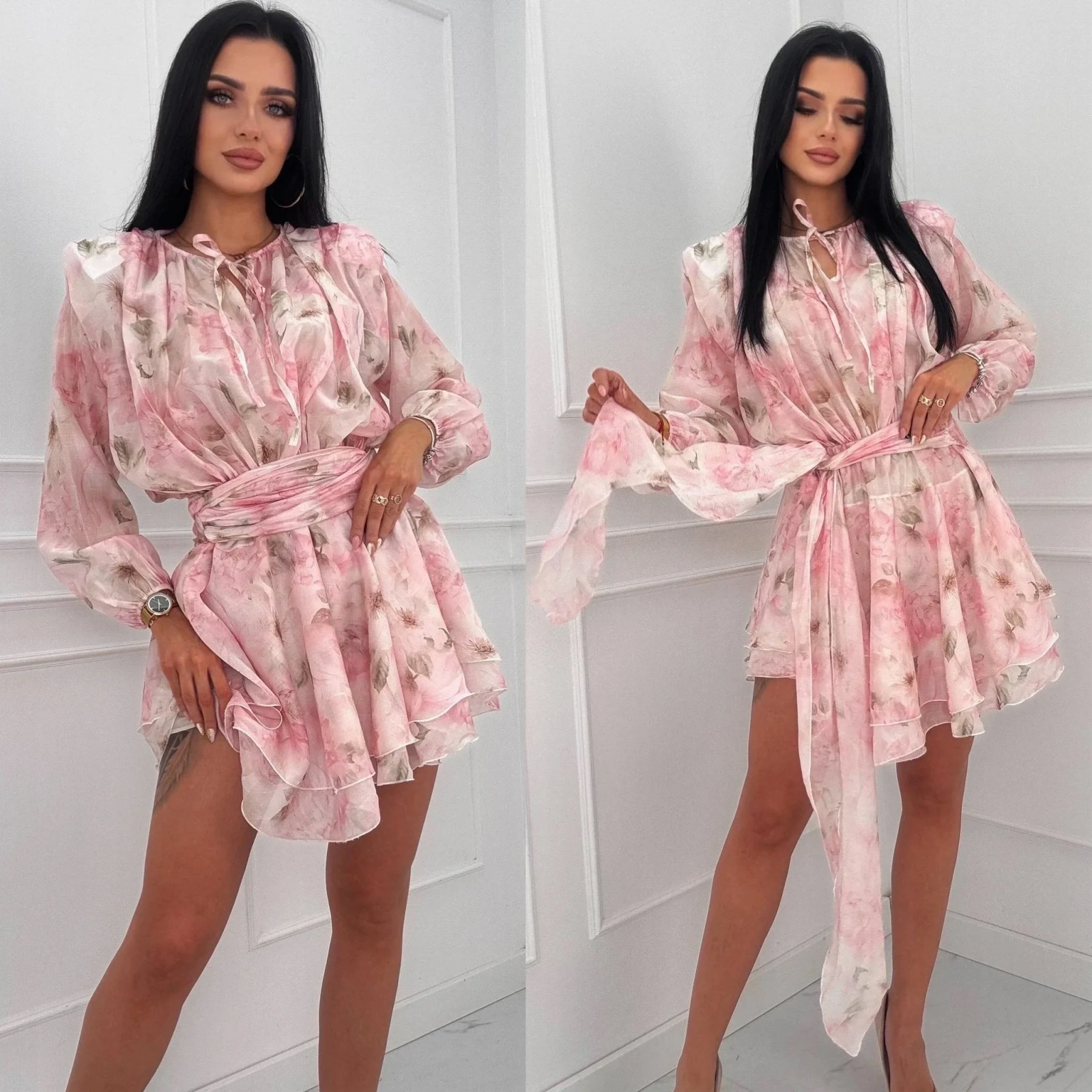 Długie rękawy zakończone gumką zapewniają wygodę. Rozkloszowany dół z podwójną falbaną dodaje lekkości. Pasek w talii pięknie podkreśla figurę. Sukienka ma długość mini, która optycznie wydłuża nogi.