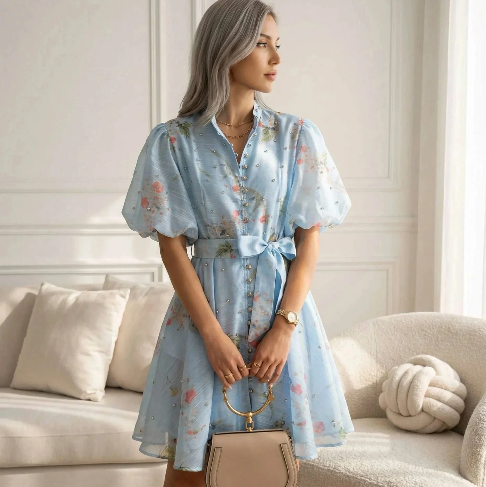 Sukienka SHINE - Błękitna Sukienka w Kwiaty z Bufiastymi Rękawami