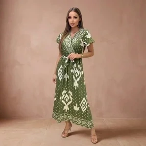 Przedstawiamy sukienkę maxi w modnym stylu boho, która łączy elegancję z casualowym luzem. Ta oliwkowa kreacja z białym etnicznym wzorem to must-have letniego sezonu.