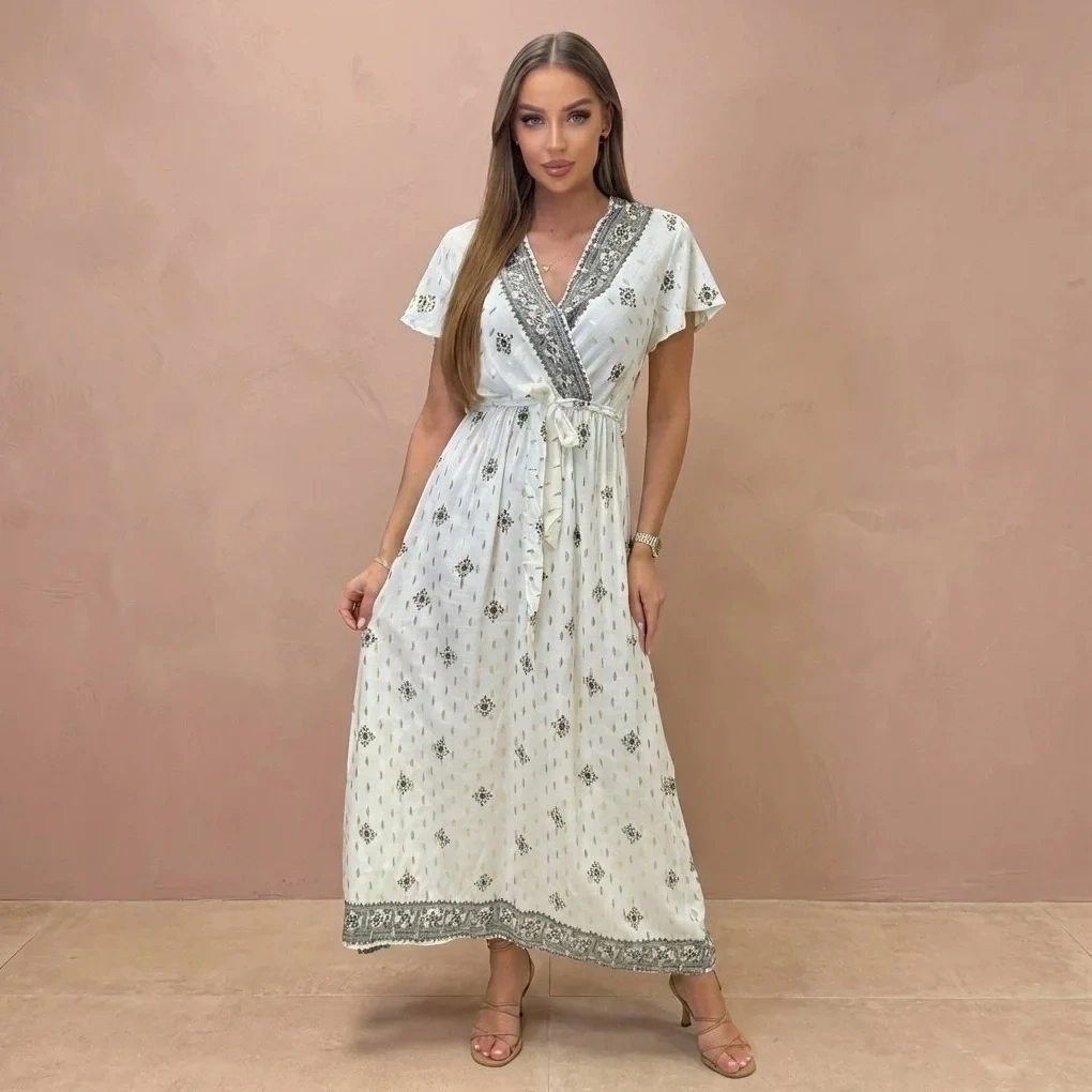 Sukienka maxi boho biała wzór orientalny dekolt V elegancka letnia długa