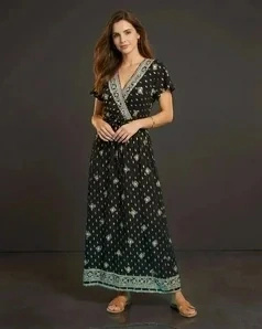 Sukienka wykonana z przewiewnego materiału zapewnia komfort nawet podczas upalnych dni. Dekolt w kształcie V ozdobiony jest kunsztowną lamówką z geometrycznym wzorem, nadającą całości orientalnego charakteru. Krótkie rękawy typu motylek dodają lekkości i swobody.