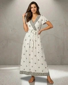 Prezentujemy wyjątkową sukienkę maxi w stylu boho, która łączy elegancję z nonszalancją. Ta biała kreacja z orientalnym wzorem to propozycja dla kobiet ceniących oryginalny design i wysoką jakość wykonania.