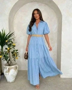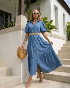 Sukienka Jeansowa Maxi Koszulowa Rozkloszowana Bufiaste Rękawy Denim Lato