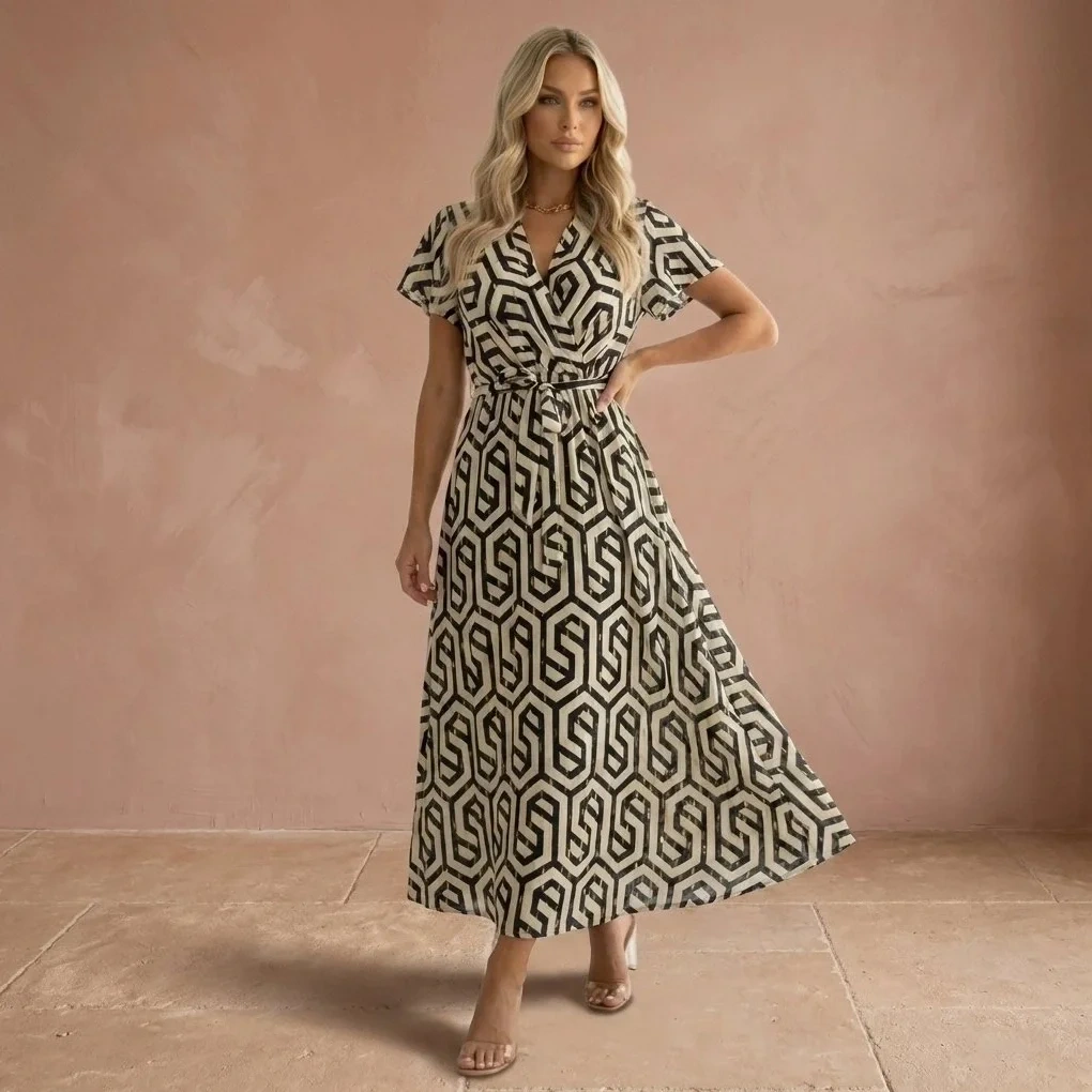 Sukienka maxi w geometryczny wzór z 100% wiskozy. Materiał oddychający, przyjemny w dotyku. Dekolt V z przekładanym przodem, krótkie rękawy – latem daje pełną swobodę. Wiązanie w talii reguluje dopasowanie.