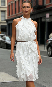 Sukienka LERDA to elegancka propozycja dla każdej kobiety. Wyróżnia się efektownymi pionowymi falbanami, które optycznie wysmuklają sylwetkę. Dekolt halter pięknie eksponuje ramiona. Długość midi zapewnia uniwersalność stylizacji.