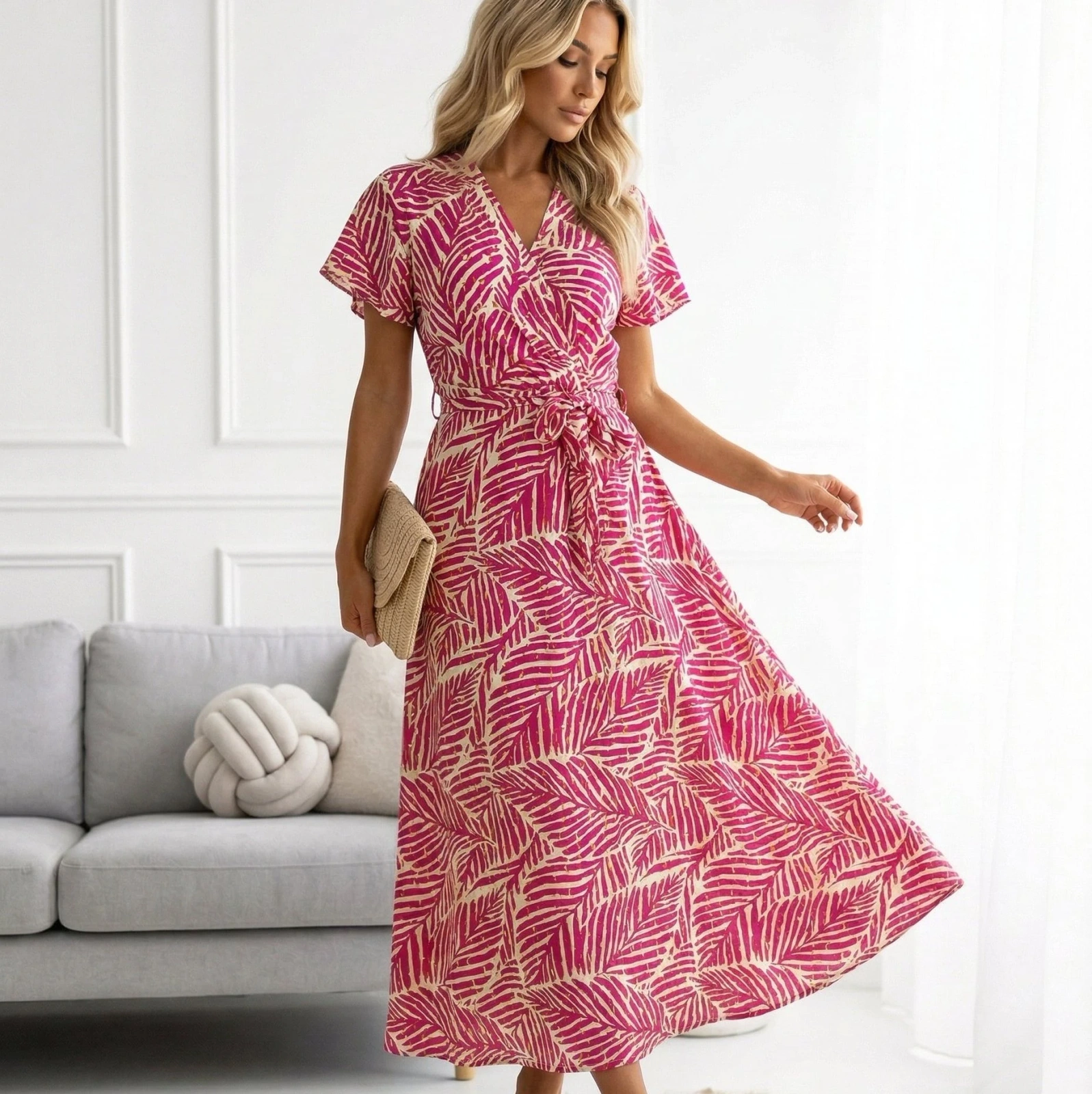Różowa sukienka maxi z dużym printem liści palmowych. Rozkloszowany fason, dekolt V, wiązanie w talii. Dobra opcja na lato, kiedy szukasz czegoś wygodnego, ale nie chcesz wyglądać jak w piżamie.