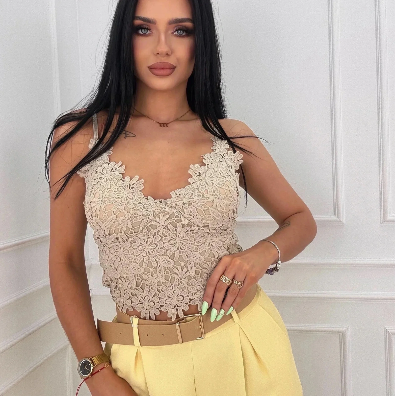 Beżowy top z koronki w kwiatowy wzór. Materiał miękki, przyjemny na skórze - nie drapie, nie uczula. Koronka gęsta, nie prześwituje.