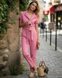 Różowy kombinezon damski elegancki z paskiem