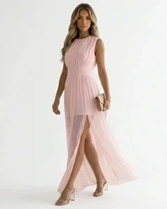 Różowa sukienka maxi SISTERS - lekka, z rozcięciem na nodze. Góra plisowana, co nadaje jej trochę faktury. Fason prosty, ale nie nudny.