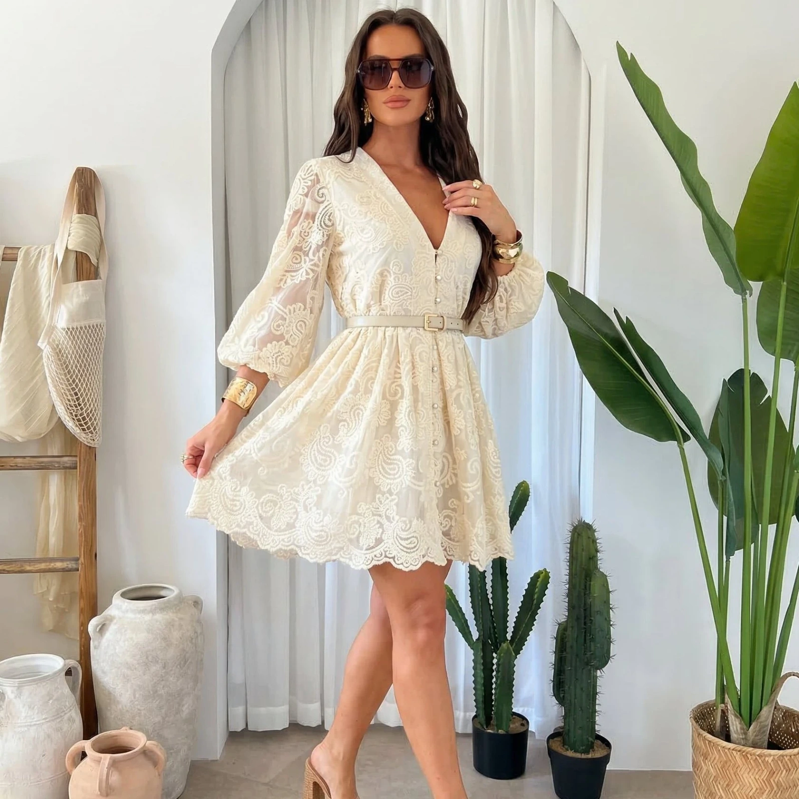 Rozmiary: S (36), M (38), L (40). Materiał: koronka. Długość: mini. Dekolt: V. Rękawy: długie bufki. Fason: rozkloszowany.