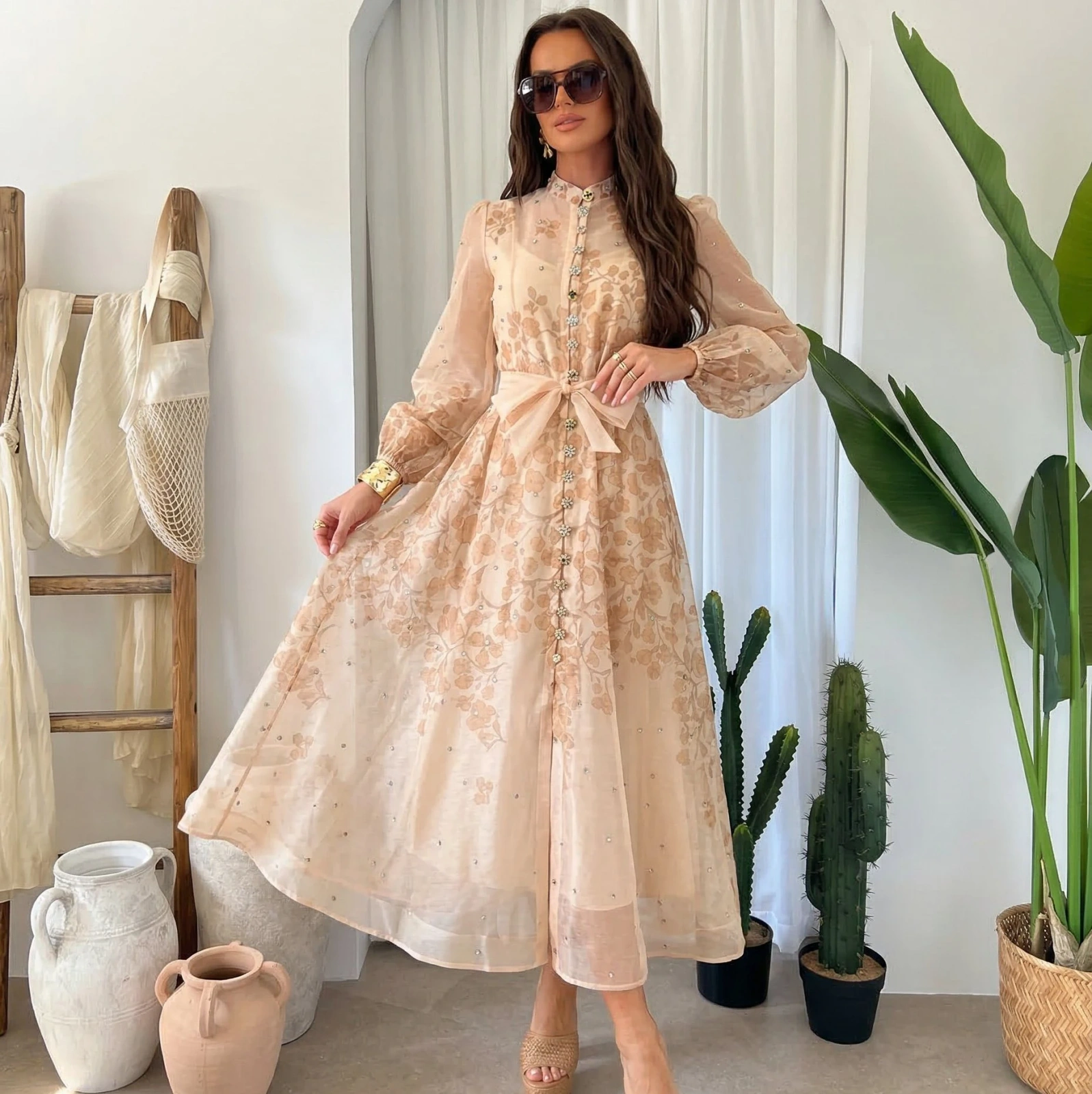 Beżowa sukienka maxi z delikatnym kwiatowym wzorem - jedna z naszych bestsellerowych propozycji na wesela i przyjęcia. Przezroczyste rękawy z bufiastym wykończeniem nadają jej romantyczny charakter, a wiązanie w talii pozwala dopasować krój do figury.