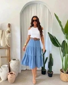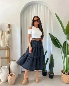 Spódnica jeansowa CLASSY w rozkloszowanym fasonie midi. Marszczenia na trzech poziomach dodają jej lekkości - ładnie faluje przy chodzeniu.