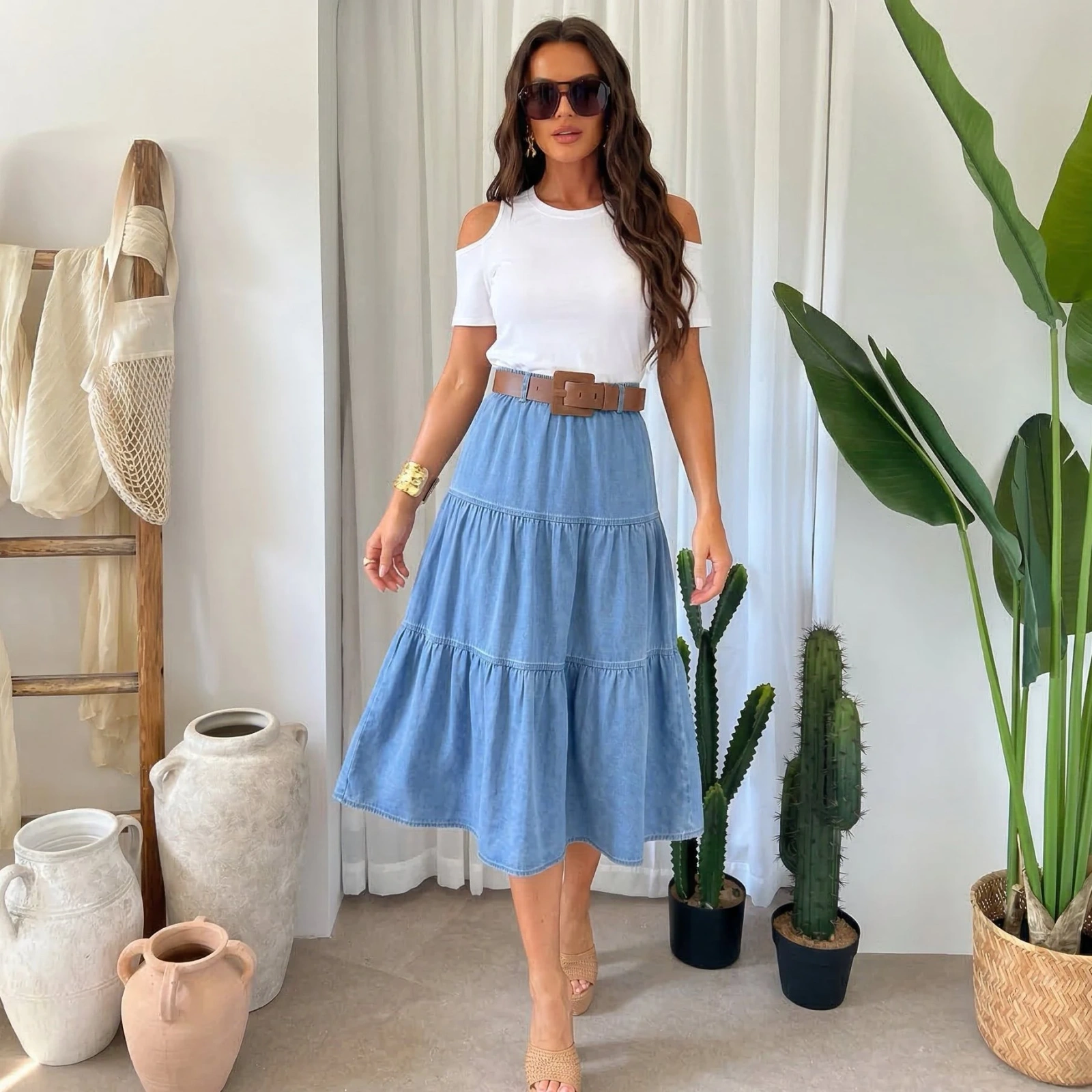 Spódnica Jeansowa Damska Rozkloszowana Midi z Marszczeniami Bawełniana z Paskiem