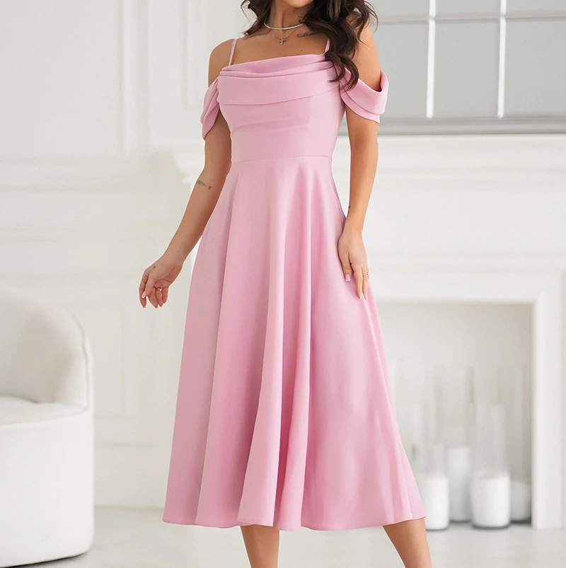 Pudrowa różowa sukienka midi z opadającymi ramionami i rozkloszowanym dołem w literę A. Klasyczny fason, który dobrze wygląda na każdej sylwetce.