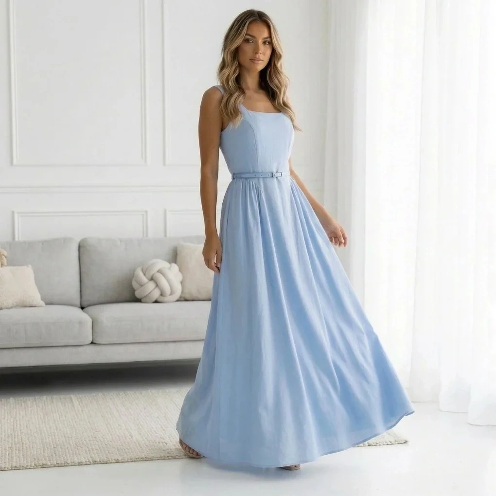Sukienka maxi z szerokimi ramiączkami i paskiem w talii. Prosty, klasyczny krój, który nie wychodzi z mody. Materiał to mieszanka bawełny i rayonu - przyjemny w dotyku i oddychający.