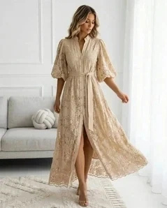 Sukienka Koronkowa Maxi Beżowa na Wesele z Bufkami i Paskiem DEDUCE