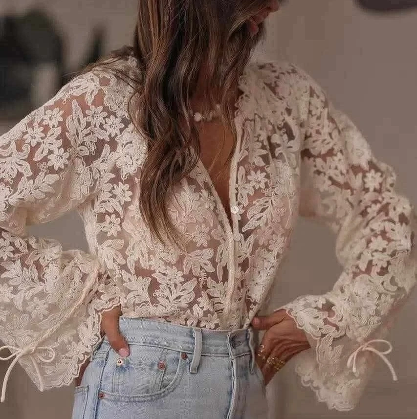 Beżowa koszula z koronki, która robi wrażenie. Kwiatowy haft tworzy ciekawy wzór na całej powierzchni. Materiał lekko prześwituje, więc warto założyć pod spód top w podobnym kolorze.