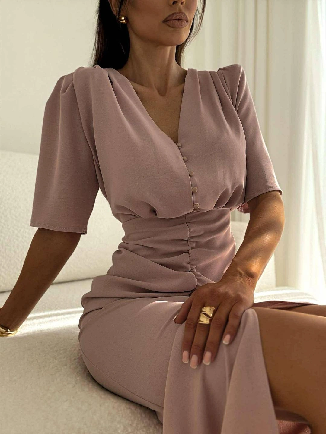 Sukienka o kobiecym fasonie, z efektownym marszczeniem w części środkowej, które pięknie modeluje sylwetkę.