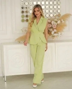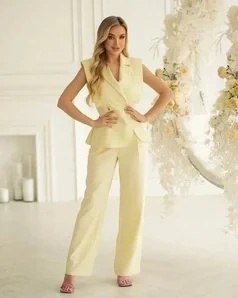 Komplet w kolorze ecru dla kobiet, które lubią klasykę, ale nie chcą się męczyć w ciasnych ubraniach. Kamizelka plus szerokie spodnie z wysokim stanem.